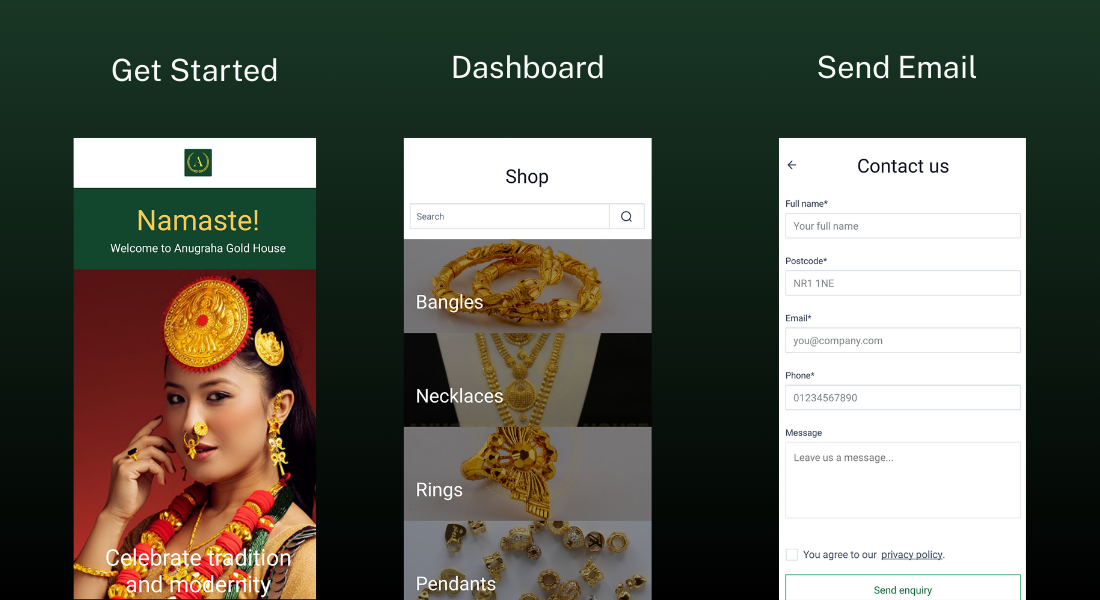 Anugraha Gold House App is a customer engagement mobile application designed for a jewelry business to showcase products and connect with customers easily. The app allows users to explore categories, view items, send enquiries, and communicate directly through WhatsApp. It also provides dynamic content, company information, and easy contact options to enhance customer experience.
